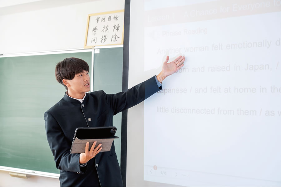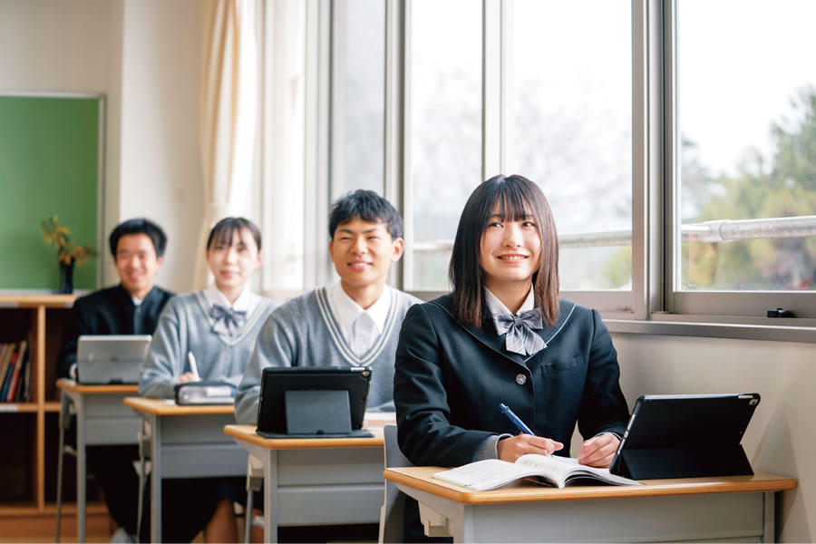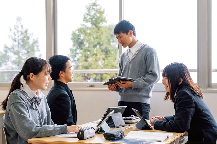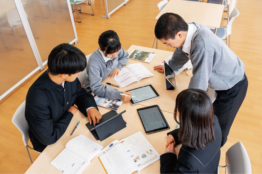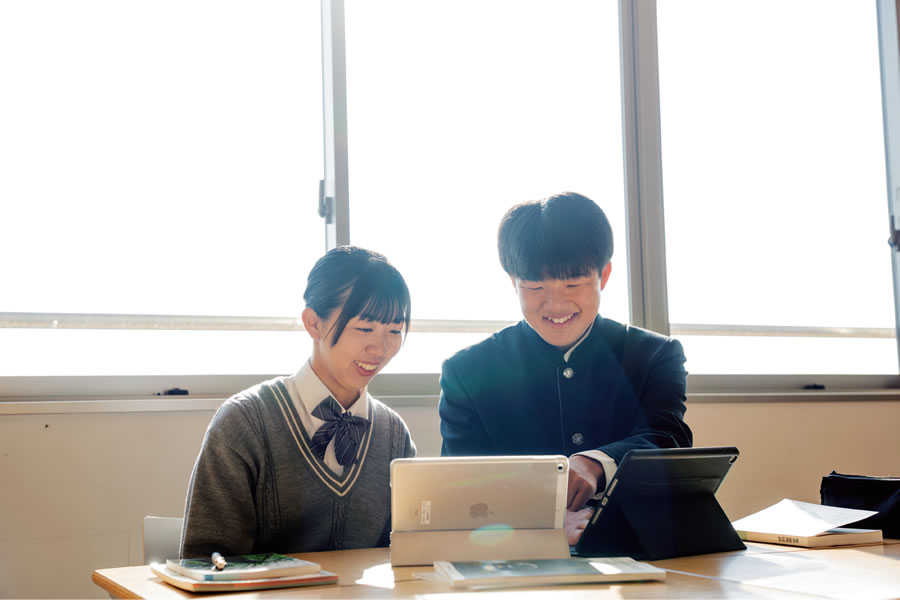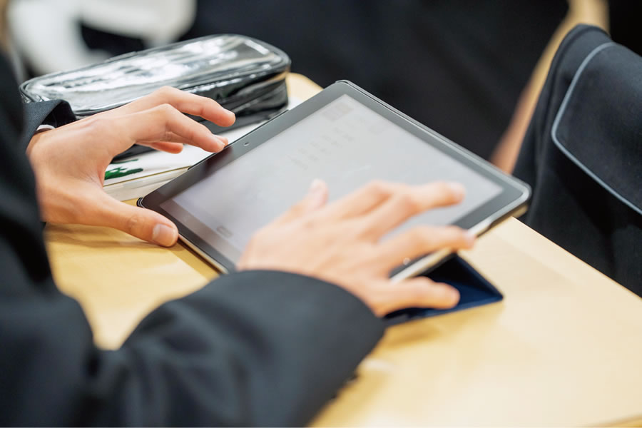 iPadを用いた学習をより効果的に進めるために、全教室、グラウンド、テニスコートなど校舎内外にWi-Fi環境を敷設し、教室にはプロジェクタを設置しています。「Classi」というプラットフォームを導入し、学習教材、AIを利用した課題の配信や生徒への連絡が可能です。また学習支援アプリ「MetaMoji」を導入し、授業中に生徒同士が意見や情報交換を簡単に行える環境を構築しています。