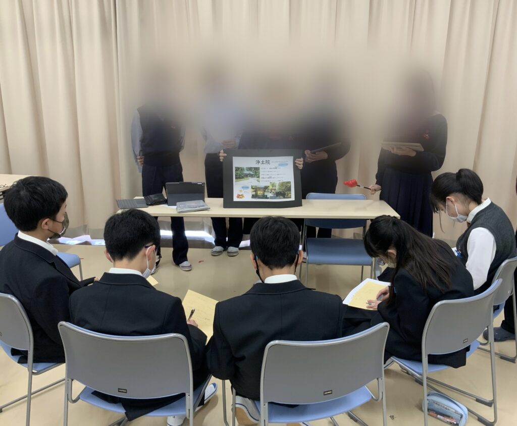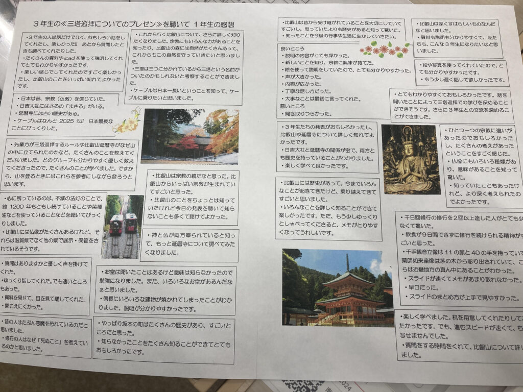 今週に予定している本校伝統行事の一つ、比叡山延暦寺をお参りする「三塔巡拝」について、3年生が1年生に対してプレゼンテーションを行いました。3年生にとってもとても良い経験になりました。