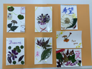比叡山中学・高校華道部が絵手紙ボランティアに参加しました。華道部ということで押し花を使ってはがきを作成しました。