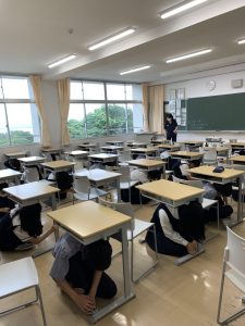 「低く、頭を守り、動かない」という安全確保行動を行いました。