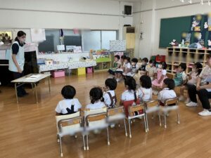 年少さんにとっては、包丁を持つのも初めての体験!先生にサポートされながらお芋を切ると・・・嬉しかったのか輪切りになったさつま芋をマジマジと眺めて😊ニコニコ笑顔が見られました。
