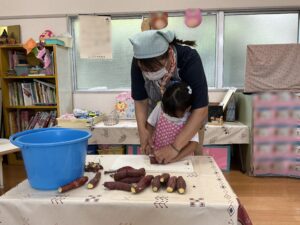そこで、今日は子ども達が収穫したさつま芋をきれいに洗って、包丁で切る!プチクッキングをしました。