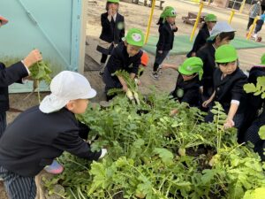 大きさに大小がありましたが、子ども達が相談し好みがあるとのことで自分の食べたい大根を自分で抜いたよ!!