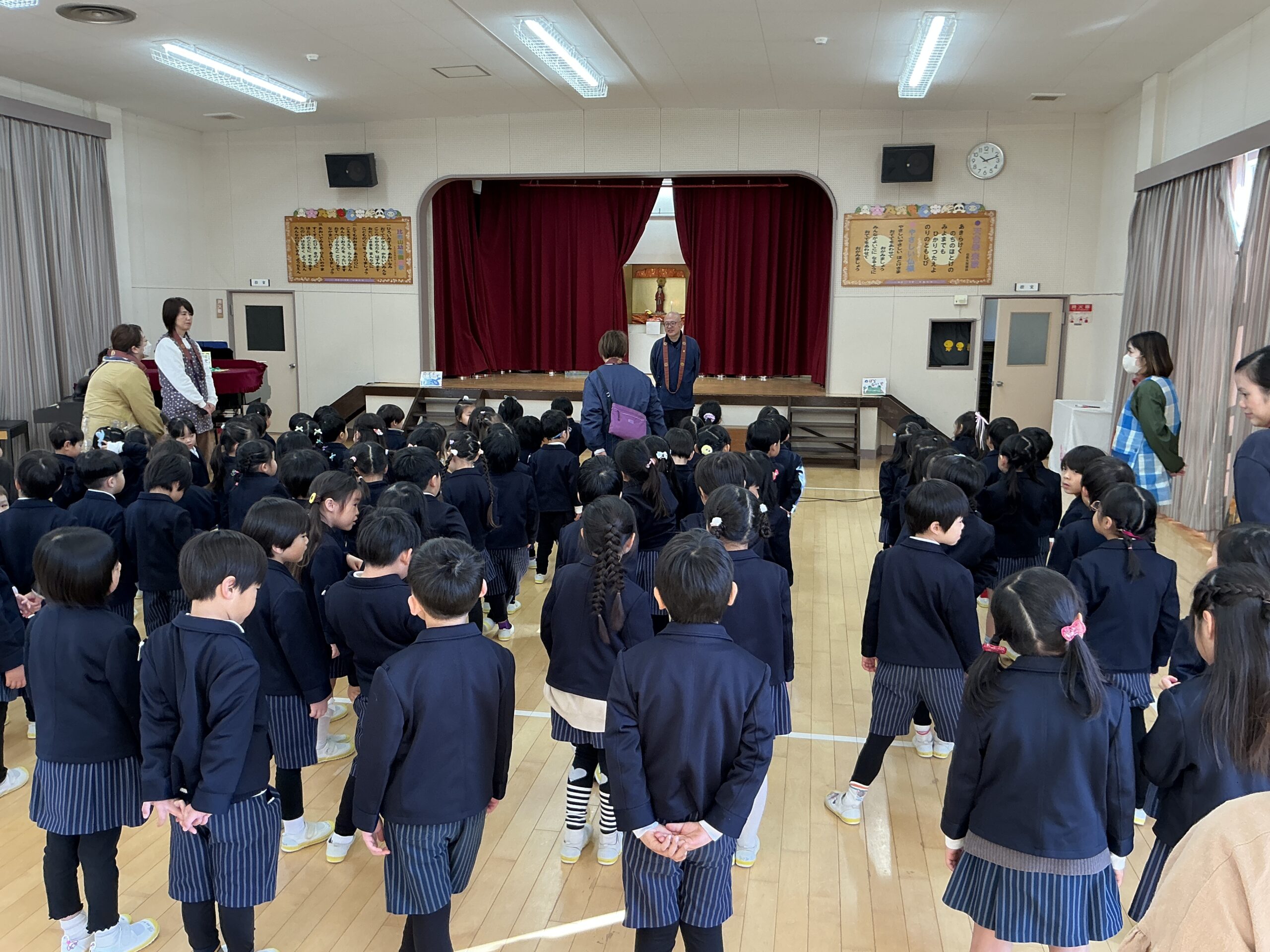 全園児ホールに集まって、2学期もいろいろな楽しい行事があったり、お友達といっぱい遊んだこと、無事に過ごせたことをのの様に感謝の気持ちを持ってお参りしました。