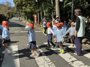 幼稚園の前の横断歩道では、自分の目で右→左→右をしっかり見て車が来ていないかどうか確認してから手を挙げて渡ります。※園外保育では道路の歩き方や横断歩道の安全な渡り方など、学びの場となります。