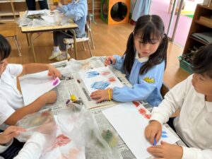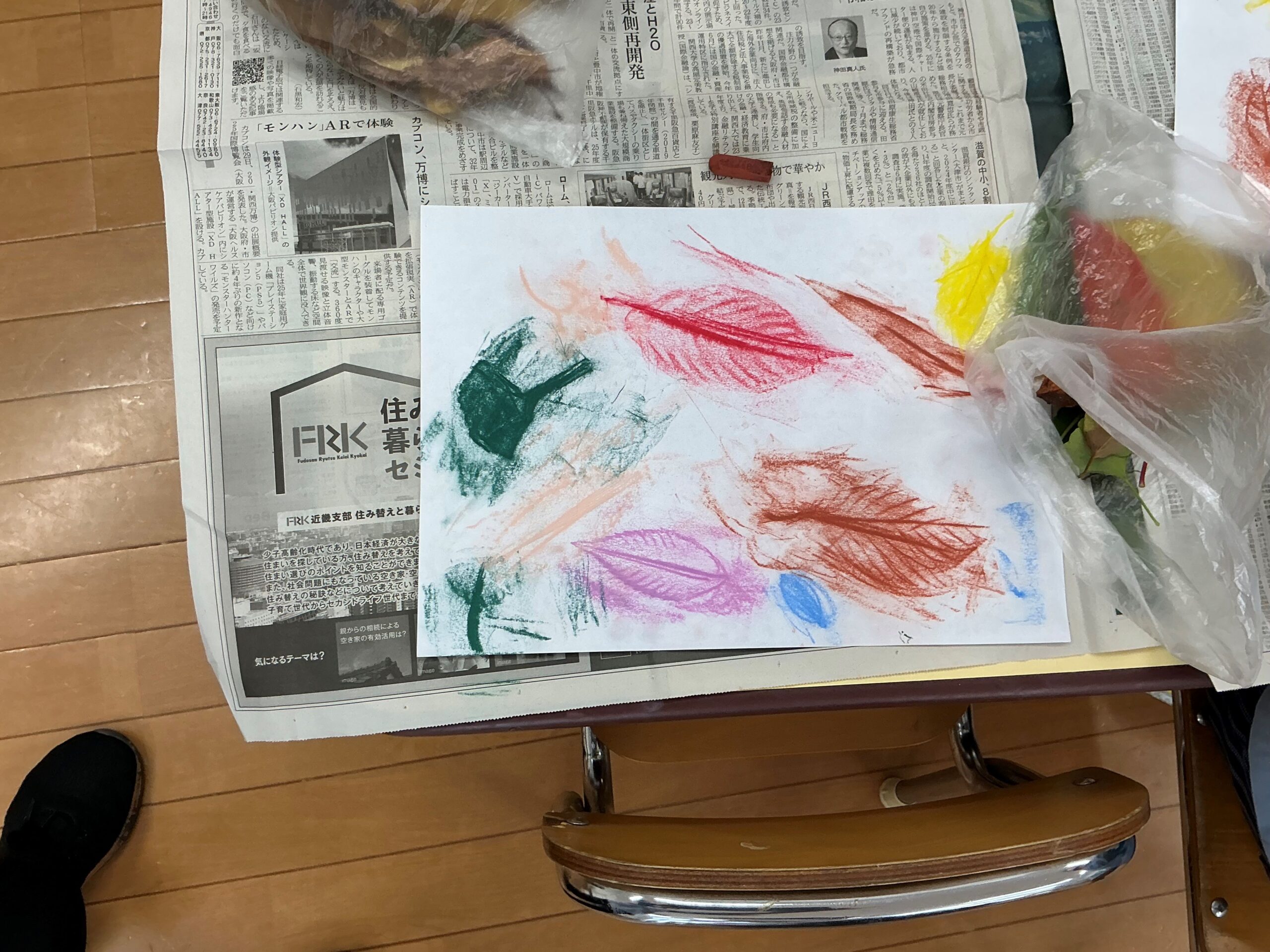 幼稚園に戻ってから、落ち葉の擦りだしをやってみました😊今回はコンテを使ったようです。うまく葉っぱの模様が出てくれるかな?