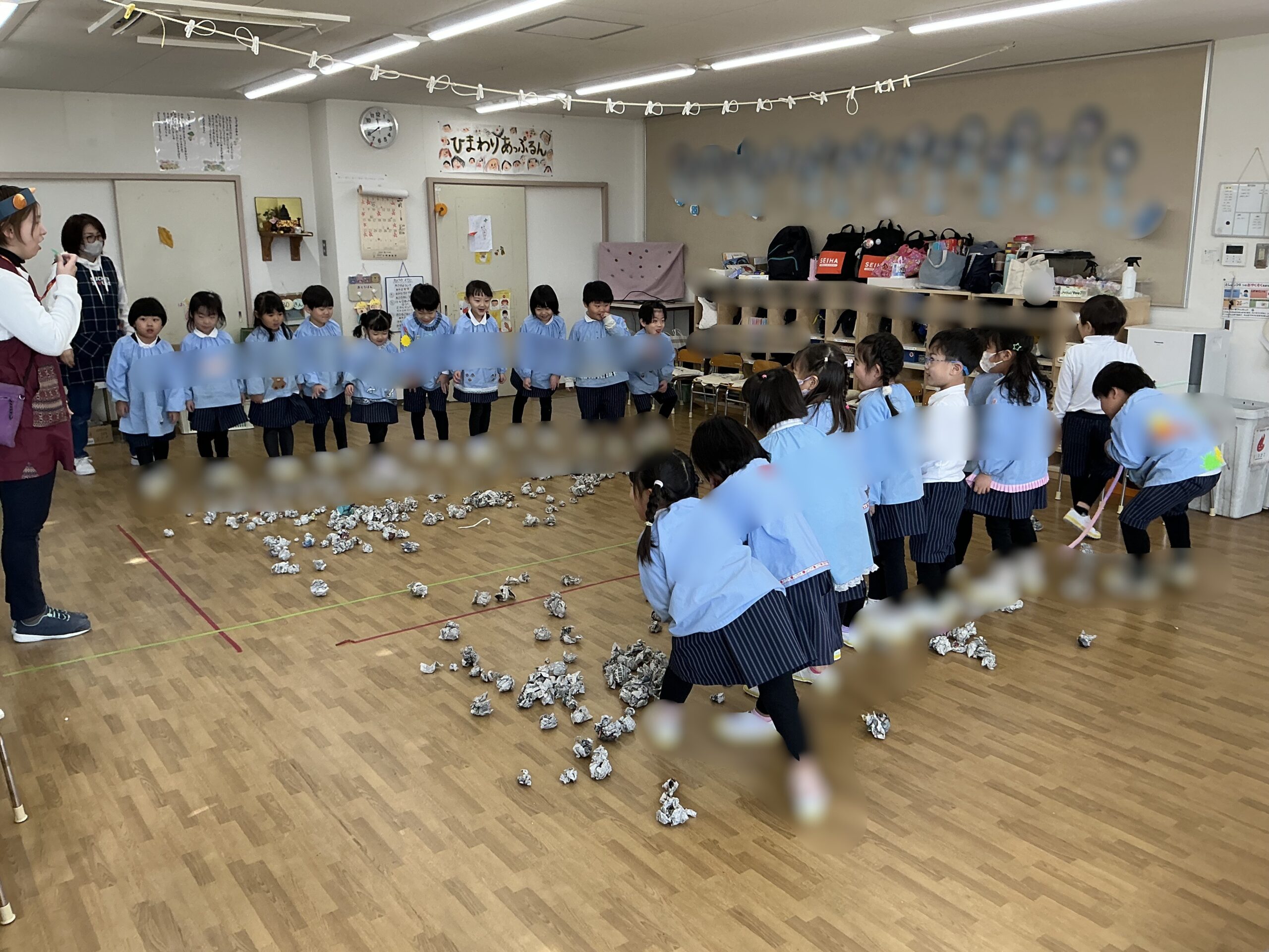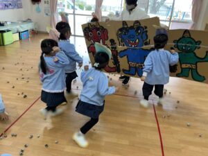 年長ではパワーを込めて紙豆を作った後、絵に描いた鬼が登場!走り回る鬼に向かって頑張って豆を投げ続けると・・・鬼が「やられた~」とひっくりかえって「やったー!!」