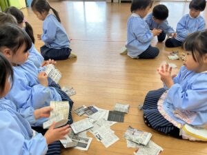 新聞紙を丸めて紙豆を作りました!パワーをいっぱい込めて作っていましたよ😄