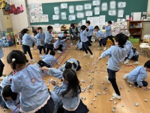 2つのチームに分かれて、豆まきゲームをしました。最後、自分の陣地に豆が少ない方が勝ち!