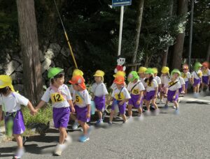グランドまでの道中は年長組さんが年中組を引率してくれます。
