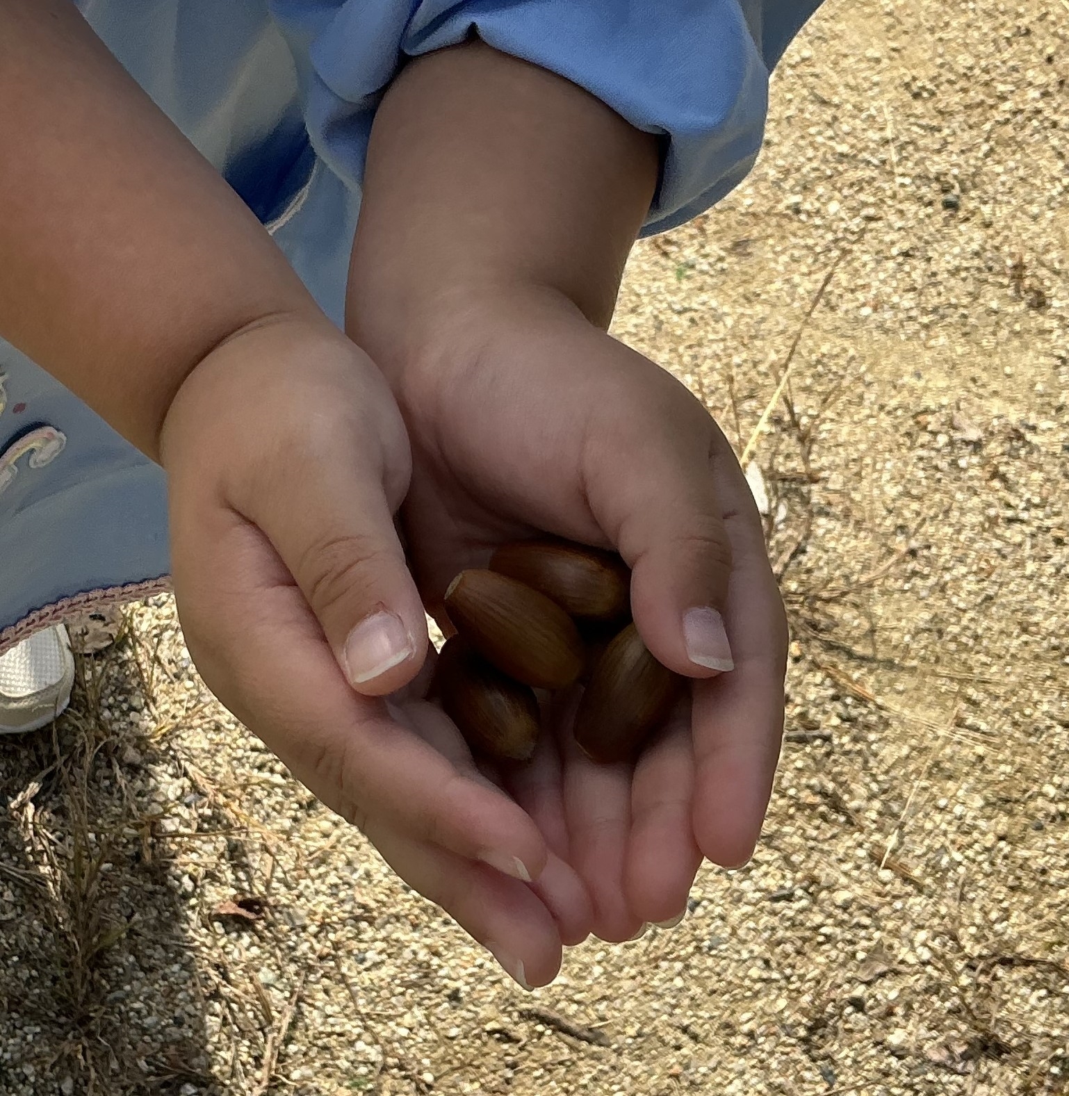 なんと!コナラやクヌギの大きな木があってビックリするくらいたくさん落ちていたのです。どんぐり拾いの始まりです😊子ども達は大喜び!!小さな可愛い手で拾ってはポケットに入れていました。