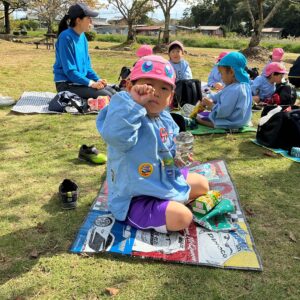 いっぱい遊んでお腹が空きましたね~お昼ごはんにしましょう😊遠足で食べるおにぎりって美味しいね!